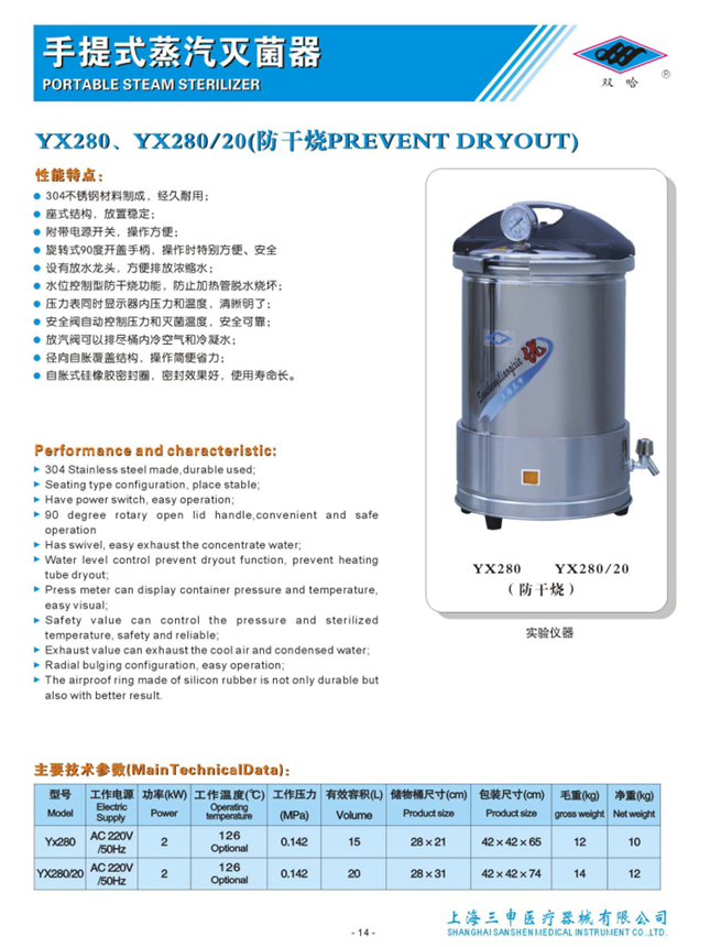 产品名称: YX280手提式不锈钢压力蒸汽灭菌器(防干烧)